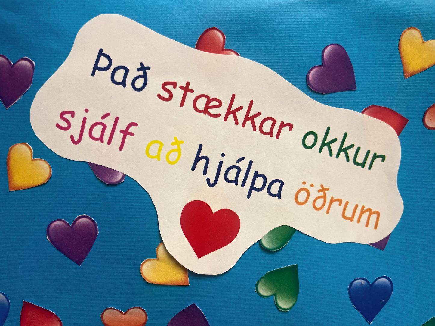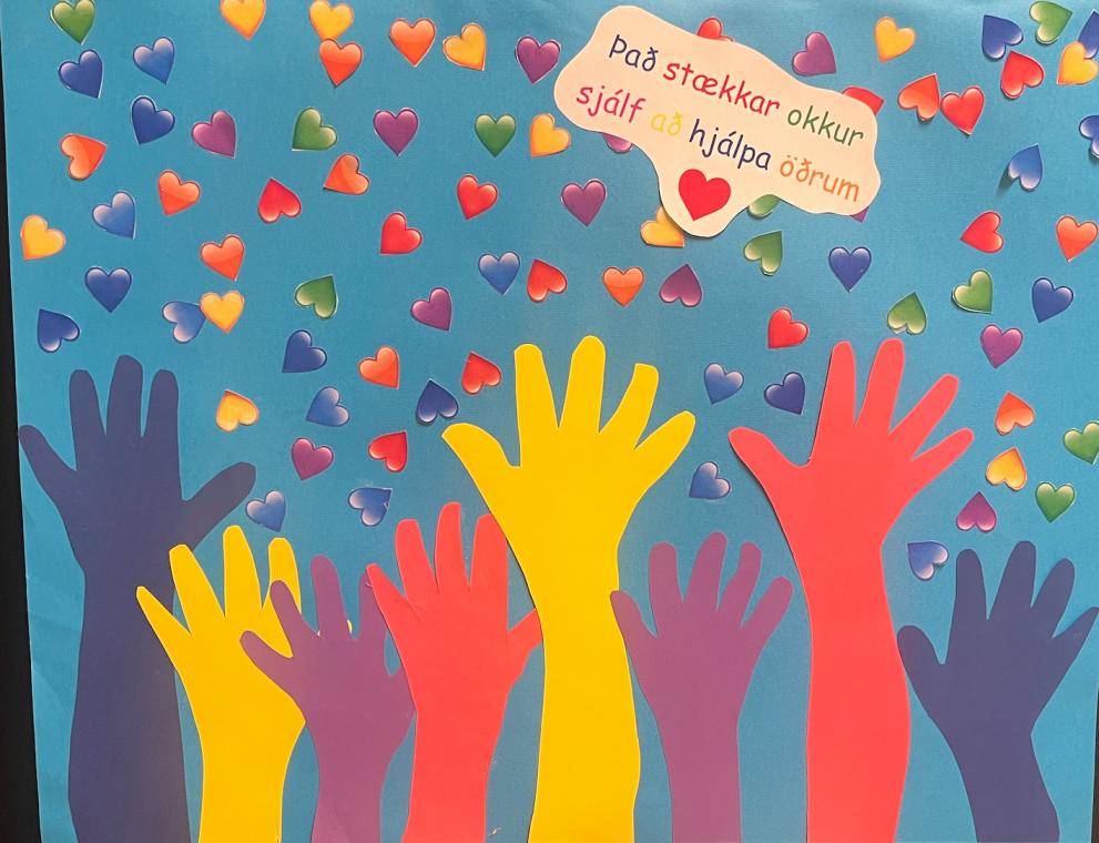 Börnin skoða einnig eigin auðkenni og uppgötva að hvert og eitt hefur sitt einstaka fingrafar. Verkefnið er myndskreytt með litríkum „hjálparhöndum“ sem eru hendur barnanna á leikskólanum. Það er von okkar að veggspjaldið og vinnan framundan hvetji til samkenndar og virðingar. Saman vöxum við og styrkjumst.